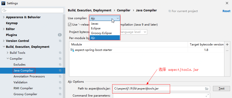 IDEA 默认使用 javac 编译器,这里需要配置 AspectJ 的编译器 ajc,在 IDEA 中做相应配置。