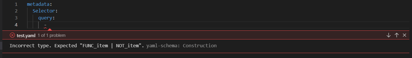 items. Instead, it is only showing properties inadditionalItemsHere is validation from visual studio code, it's saying that first element should be FUNC_item or NOT_item