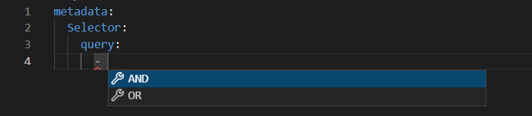 itemsfor first element of array. Specifically, NOT and array item (having 3 properties "attribute", "operation", "value" ) should be showing up.From second element onwards, the auto-complete shows AND and OR